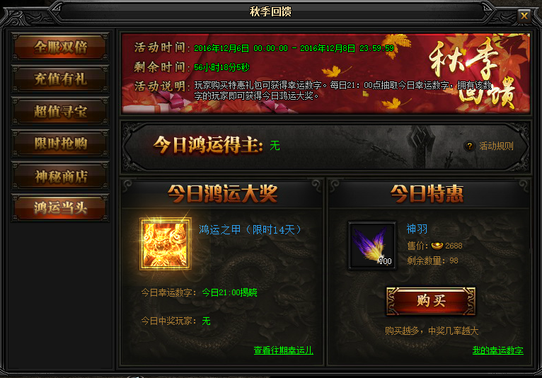 活动说明 : 玩家购买特惠礼包可获得幸运数字。每日21:00点抽取今日幸运数字,拥有该数字的玩家即可获得今日鸿运大奖。