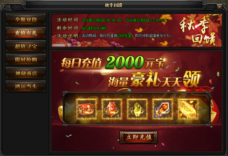 活动说明:活动期间,每日充值满2000元宝,即可领取超值豪华大礼。