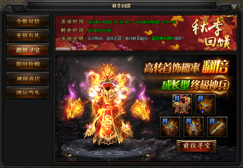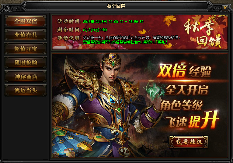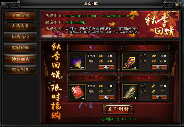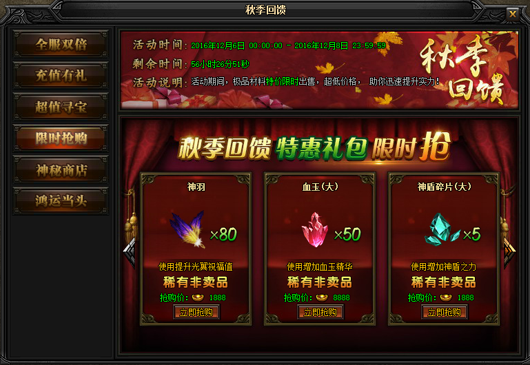 秋季回馈活动时间:2016年12月6日00:00:00-2016年12月8日23:59:59