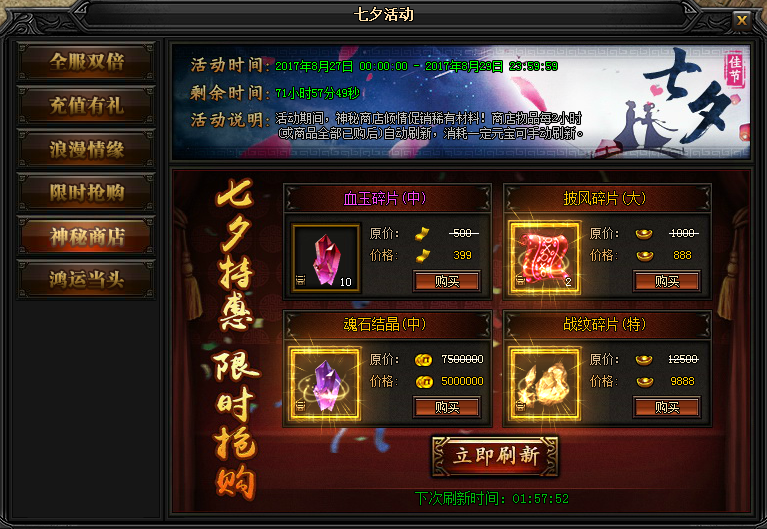 活动说明:活动期间,神秘商店再度开启,稀有材料超低价出售,不容错过!商店物品每2小时自动刷新,消耗一定元宝可立即刷新后每样物品限购一次。