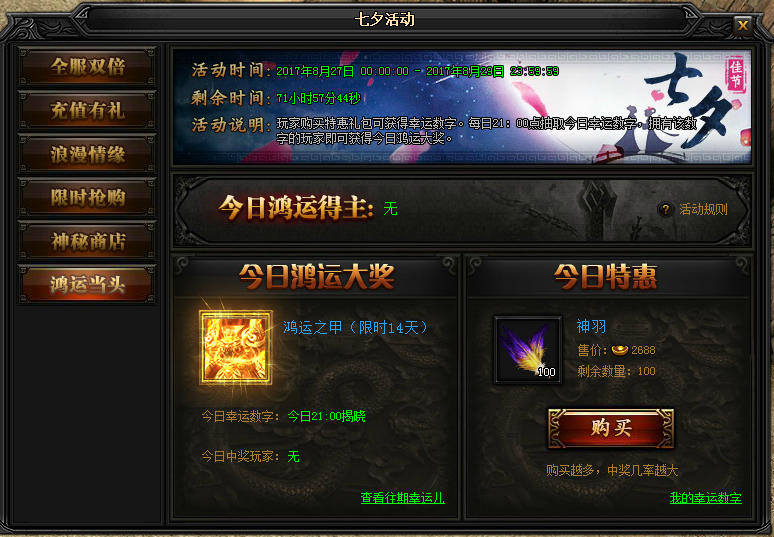 活动说明 : 玩家购买特惠礼包可获得幸运数字。每日21:00点抽取今日幸运数字,拥有该数字的玩家即可获得今日鸿运大奖。