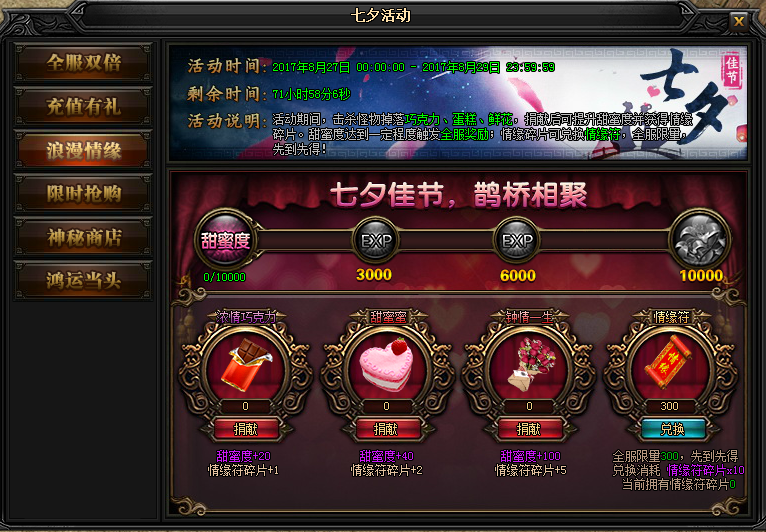 活动说明:活动期间,击杀怪物掉落巧克力、蛋糕、鲜花,捐献后可提升甜蜜度并获得情缘碎片。甜蜜度达到一定程度触发全服奖励!情缘碎片可兑换情缘符,全服限量,先到先得!