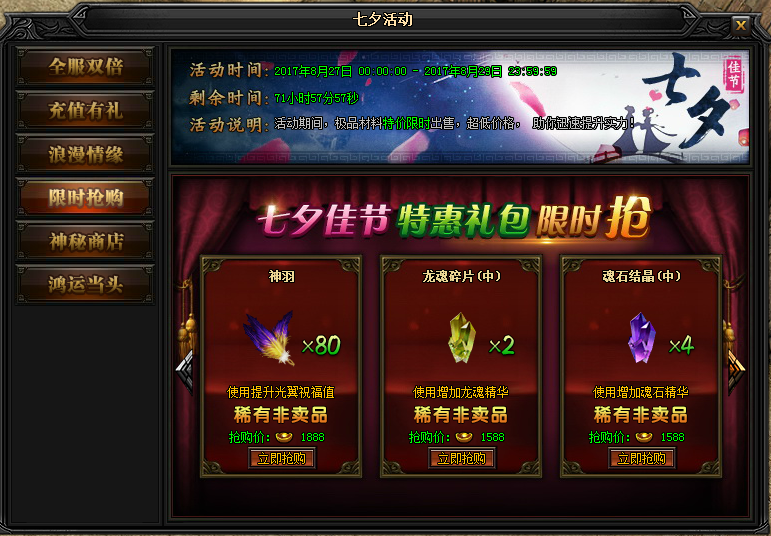 七夕活动时间:2017年8月27日00:00:00-2017年8月29日23:59:59