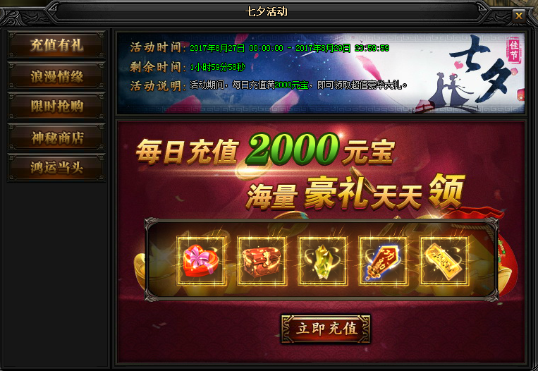 活动说明:活动期间,每日充值满2000元宝,即可领取超值豪华大礼。